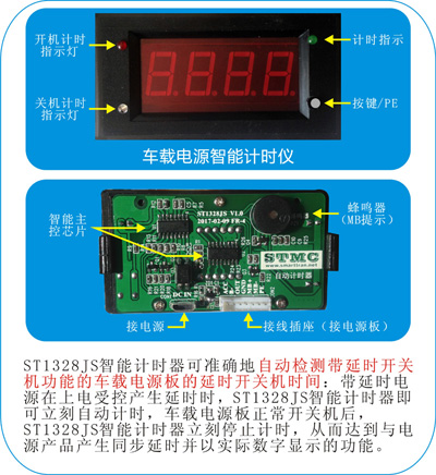 ST1328JS智能计时器可准确地自动检测带延时开关机功能的车载电源板的延时开关机时间:带延时电源在上电受控产生延时时,ST1328JS智能计时器即可立刻自动计时,车载电源板正常开关机后,ST1328JS智能计时器立刻停止计时,从而达到与电源产品产生同步延时并以实际数字显示的功能。